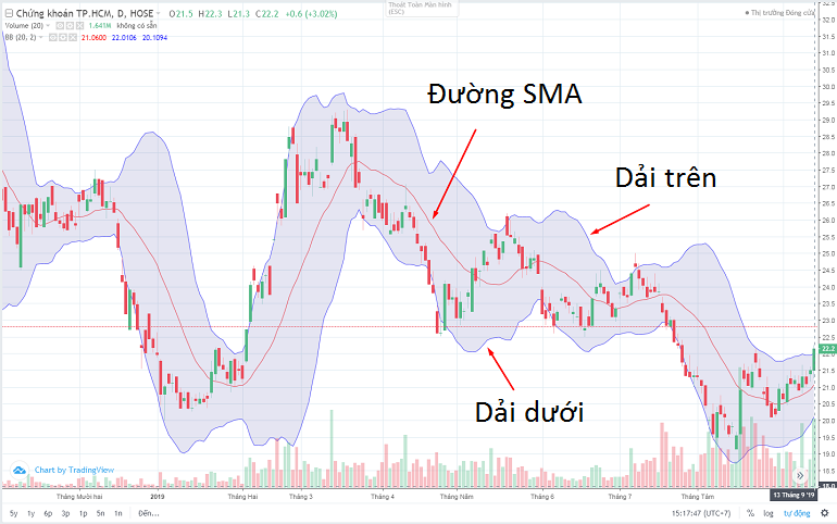 Bollinger Band là một công cụ phân tích kỹ thuật xác định bởi đường trung bình đơn giản (Simple Moving Average – SMA) ở giữa, dải trên và dải dưới. Dải Bollinger bands sẽ tự điều chỉnh mở rộng trong các giai đoạn thị trường biến động và thu hẹp trong các giai đoạn thị trường ít biến động hơn.