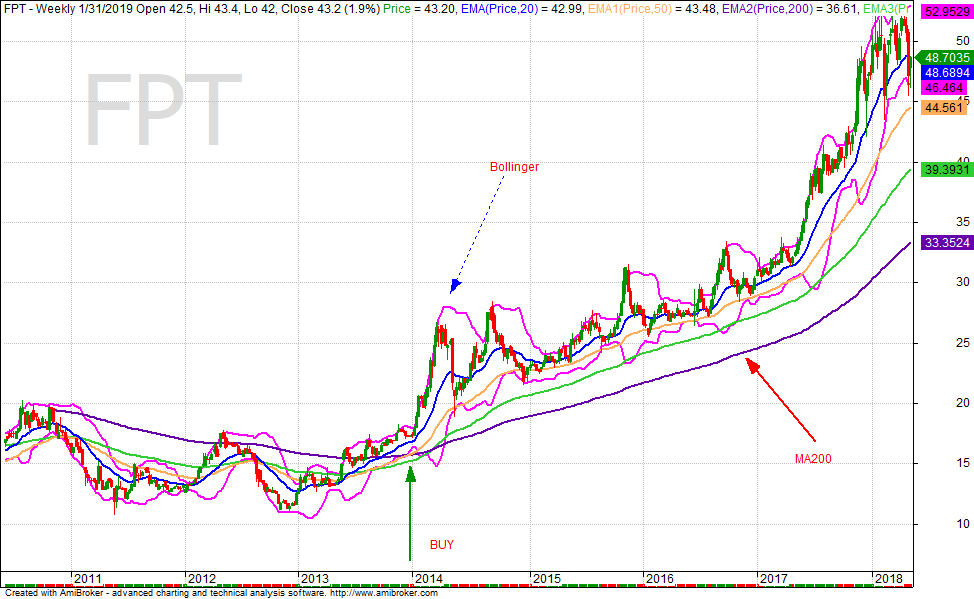 Trường hợp FPT trong ví dụ trên cho thấy sự xuất hiện tín hiệu Mua ngay khi dải bollinger vượt khỏi đường trung bình động dài hạn MA200 và hình thành một xu thế đảo chiều từ giảm sang tăng rất tích cực.