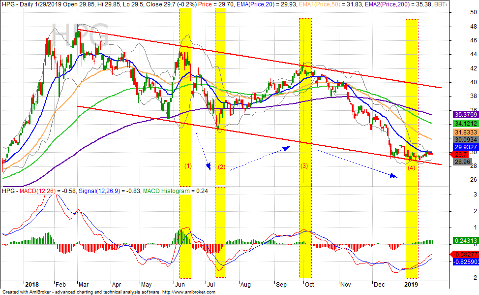 Tại thời điểm (1) HPG đã đảo chiều giảm cùng với MACD phân kỳ âm và xuyên thủng mức 0 cho thấy đà giảm đang tăng tốc thậm chí đường trung bình động ngắn hạn MA20 không thể chặn đứng được đà giảm này cho tới khi chạm tới đường trung bình động dài hạn MA200.